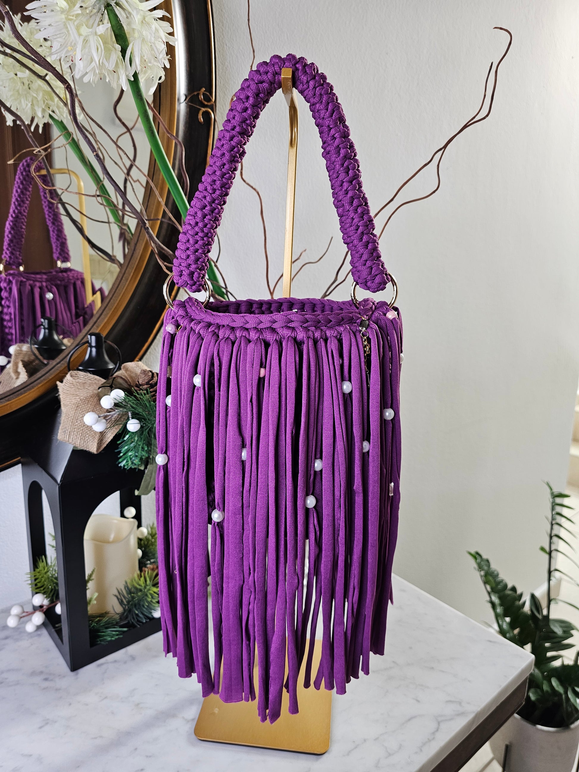 Handmade bucket bag, round bottom. Handle is crocheted. Fringes add movement. Elegant and show stopper