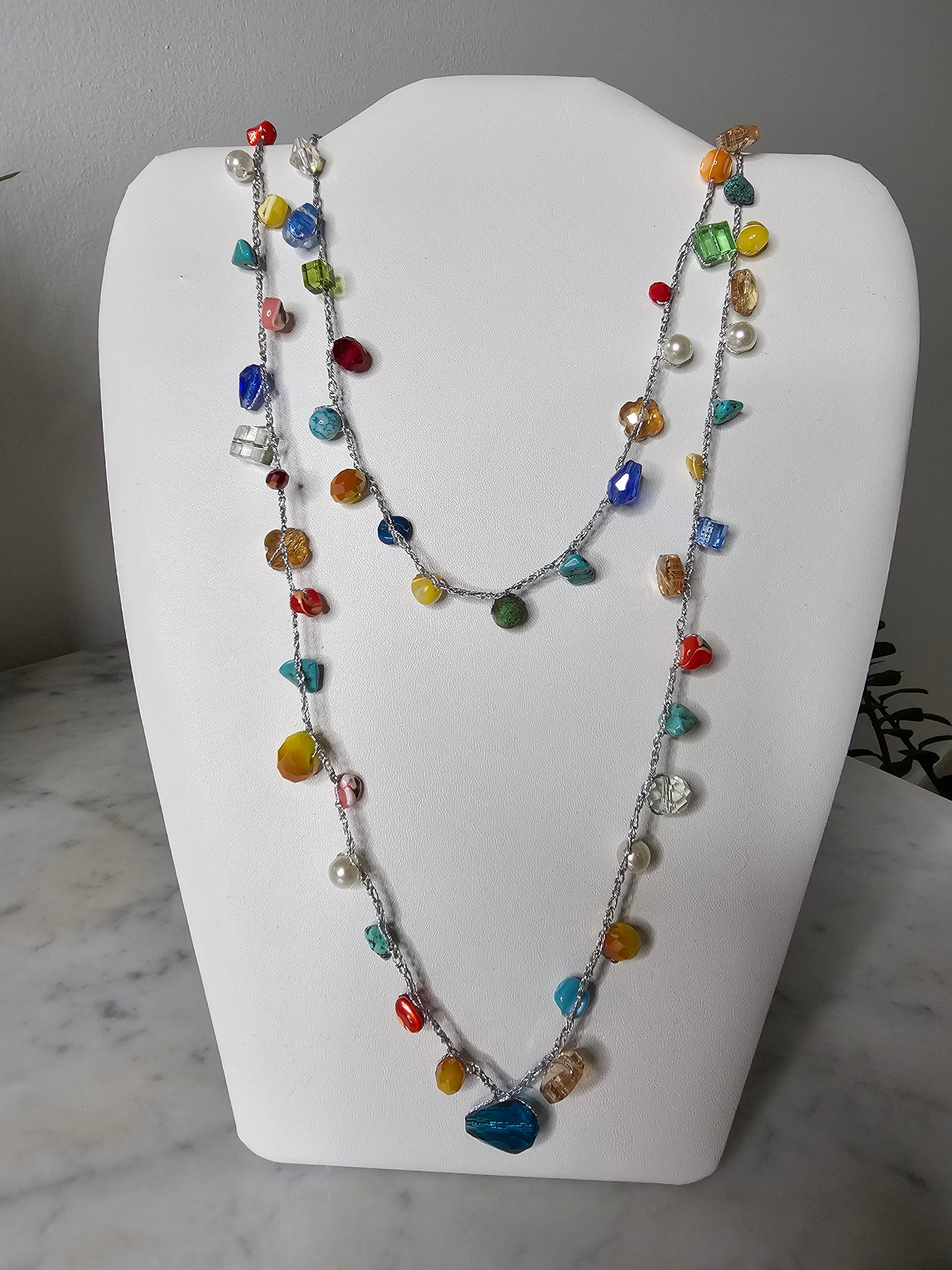 Handmade crochet necklace trending. It's called thousand rounds. It's extra long and can be wrapped around the neck for a layered look. It also can be wrapped around the wrist and make it a bracelet. You can use it around the waist as a accent piece for your outfit.