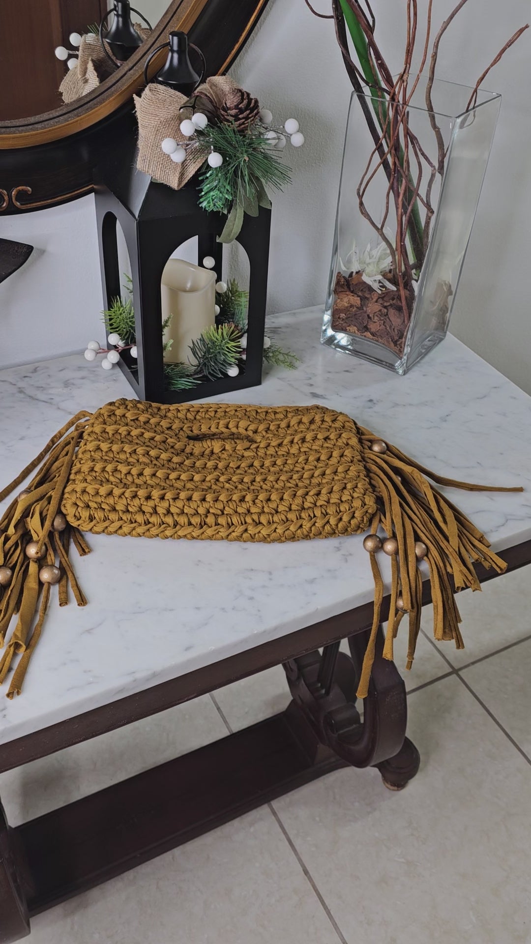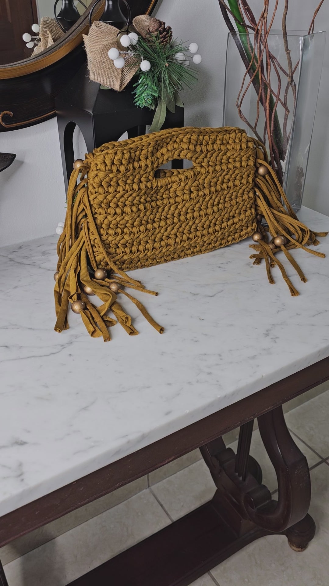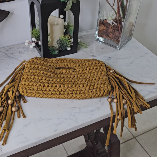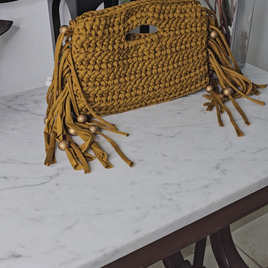 Handmade clutch with fringes and beaded details.