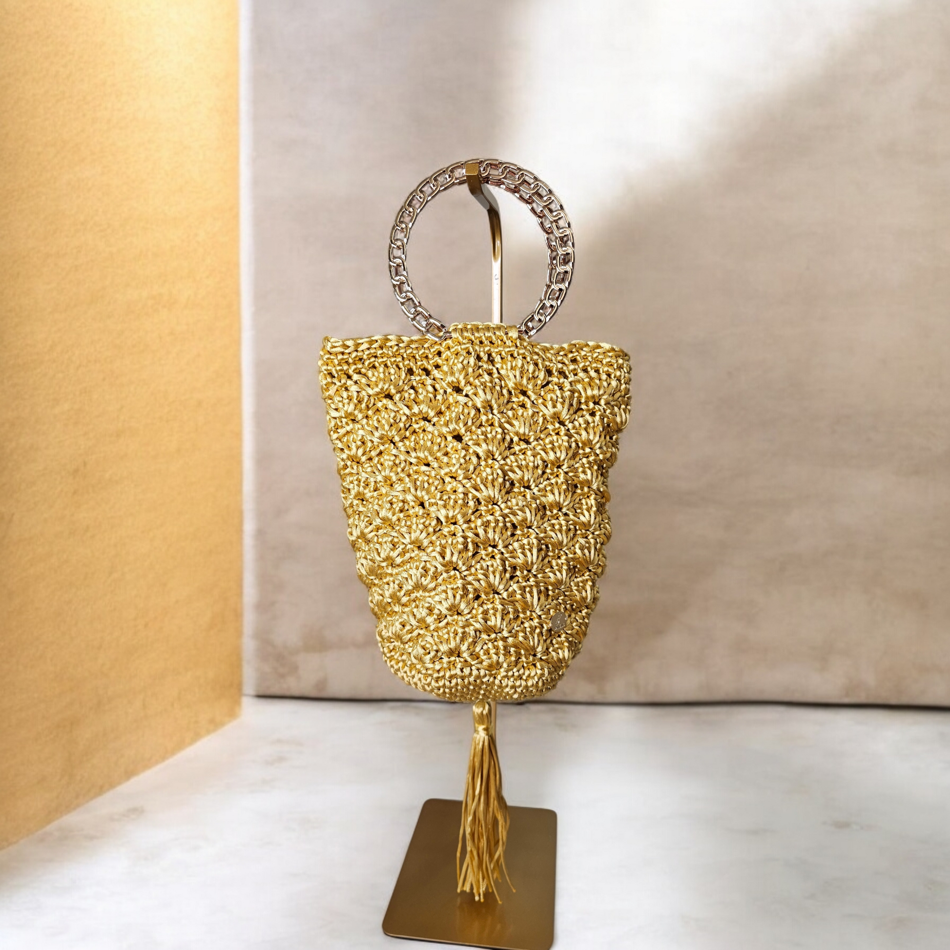 Made with satin cord, unique fan stich and round chain metal handle. Statement piece. Elegant and unique