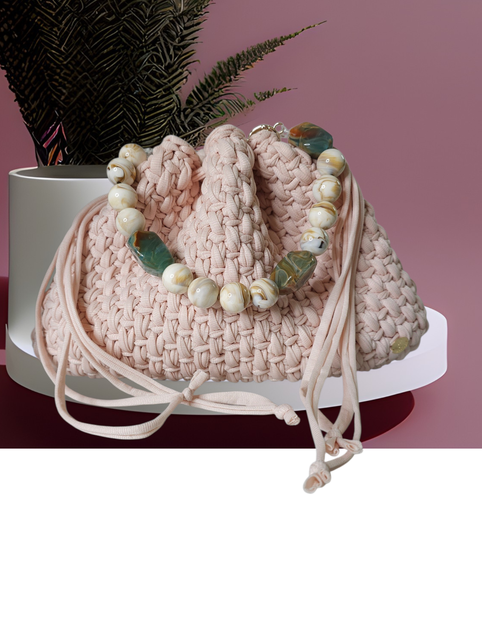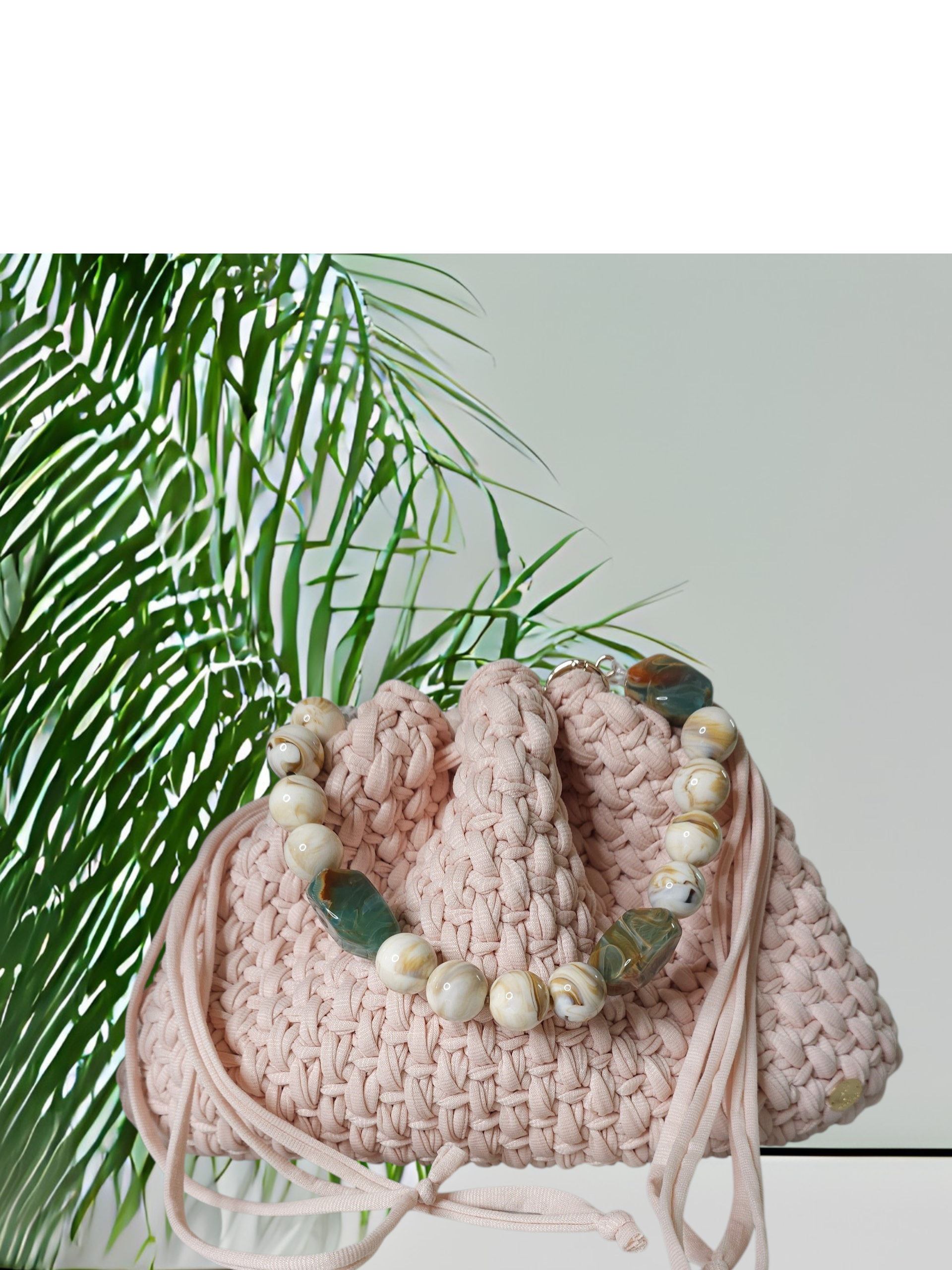 Trendy pouch bag with basket stich. Pull String closure. Has a crochet handle to wear on shoulder.